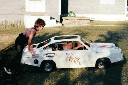 Buddy's father was Rupp's purchasing agent for 11 years and this allowed Buddy and his brother Gary access to some really cool Rupp products. Pictured at the right is a custom fiberglass R&D Go Kart outfitted with a Tecumseh 5HP motor and Dellorto carburetor. This is a pre-production unit from which the plastic bodied go karts would be produced. Buddy is pictured behind the kart watching his brother Gary behind the wheel. Buddy Baker's collection includes a couple of L-100's, a 1971 Roadster 2, a 1972 RST, a L-80, an RMT, and couple of 1976 Nitro 440's. Pictured below is a Rupp promotional piece for the 1975 bikes. Buddy is modeling in the picture, and is shown kneeling down next to the brown Roadster 2. 1975 Rupp Minibikes (Rupp Promotional Image)
