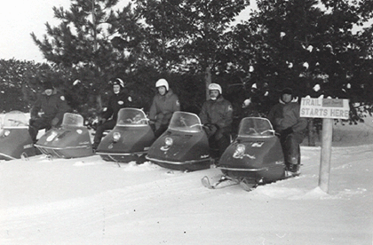 This picture, from December 1969, depicts Darin's father in the middle. The first three on the right are Rupps, followed by a Skiroule. Can you identify the last sled on the left?