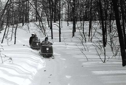 Here are two more black and white images that were also taken in December of 1969. This picture below shows five of the seven sleds Darin's family owned when he was a child. Shown, from left to right, are a 1969 Sno-Sport, a 1972 Rouge, a 1972 Sport, a 1972 Yankee, and a 1971 Wide Track with a 634cc Hirth motor.