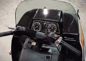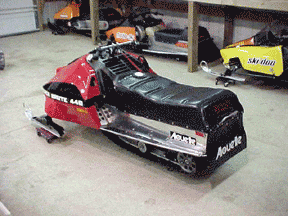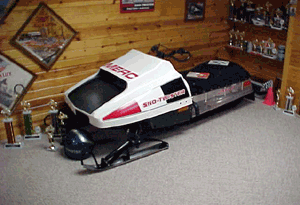 The following pictures show four more sleds, and represent the diversity of Tim's collection. Listed below are a 1979 Polaris TX 440cc free air, a liquid-cooled 1979 Moto Ski Sonic 340, a 1973 Rupp Magnum, and a 1976 Merc Sno-Twister, the last one being displayed in Tim's basement. I've got two words for that: Understanding Wife. 1979 Polaris TX 440cc & 1979 Moto-Ski Sonic 340cc L/C