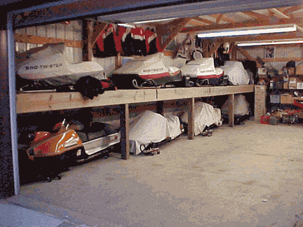 This picture below is the first thing you see when you enter his garage. Notice the row of rare Merc Sno-Twisters on the upper shelf. What a sight!