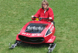 Pictured below is Bill's 1975 "What If" creation. This sled featres a 650cc free air motor. Note his wife, Becky, sitting on the sled in the first picture and the "Mini 3D" in the second picture. 1975 Rupp "What If" Sno-Pro